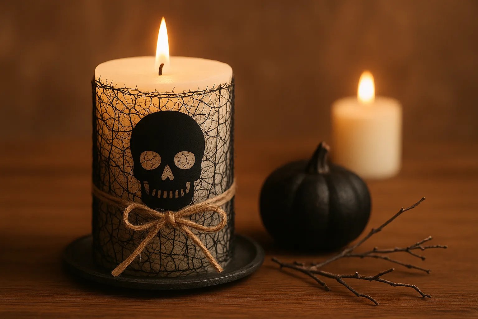 Además de quemar más limpio y durar más, su luz es cálida y serena. No necesitas una vela temática: una vela blanca o en tono marfil es perfecta para personalizar.