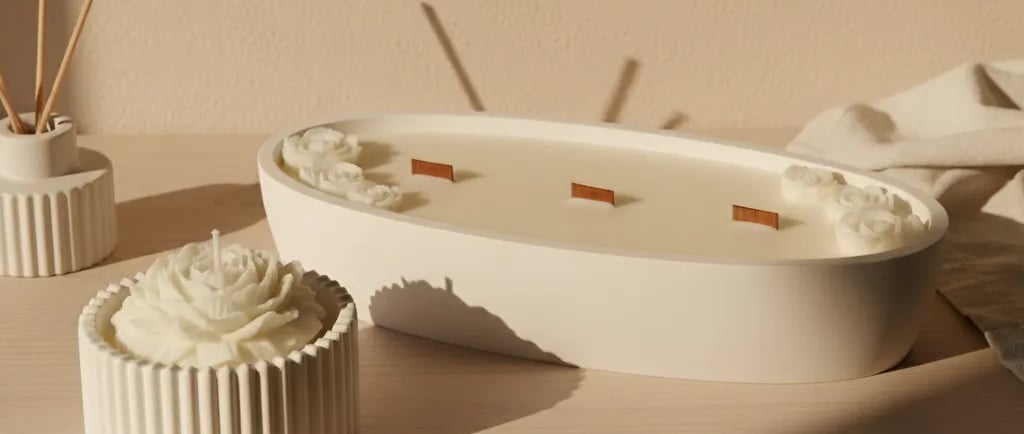 Imagina una mesa de boda decorada con pequeñas velas de soja, cada una con un aroma diferente: flores blancas, madera fresca, jazmín, vainilla o ámbar suave.
